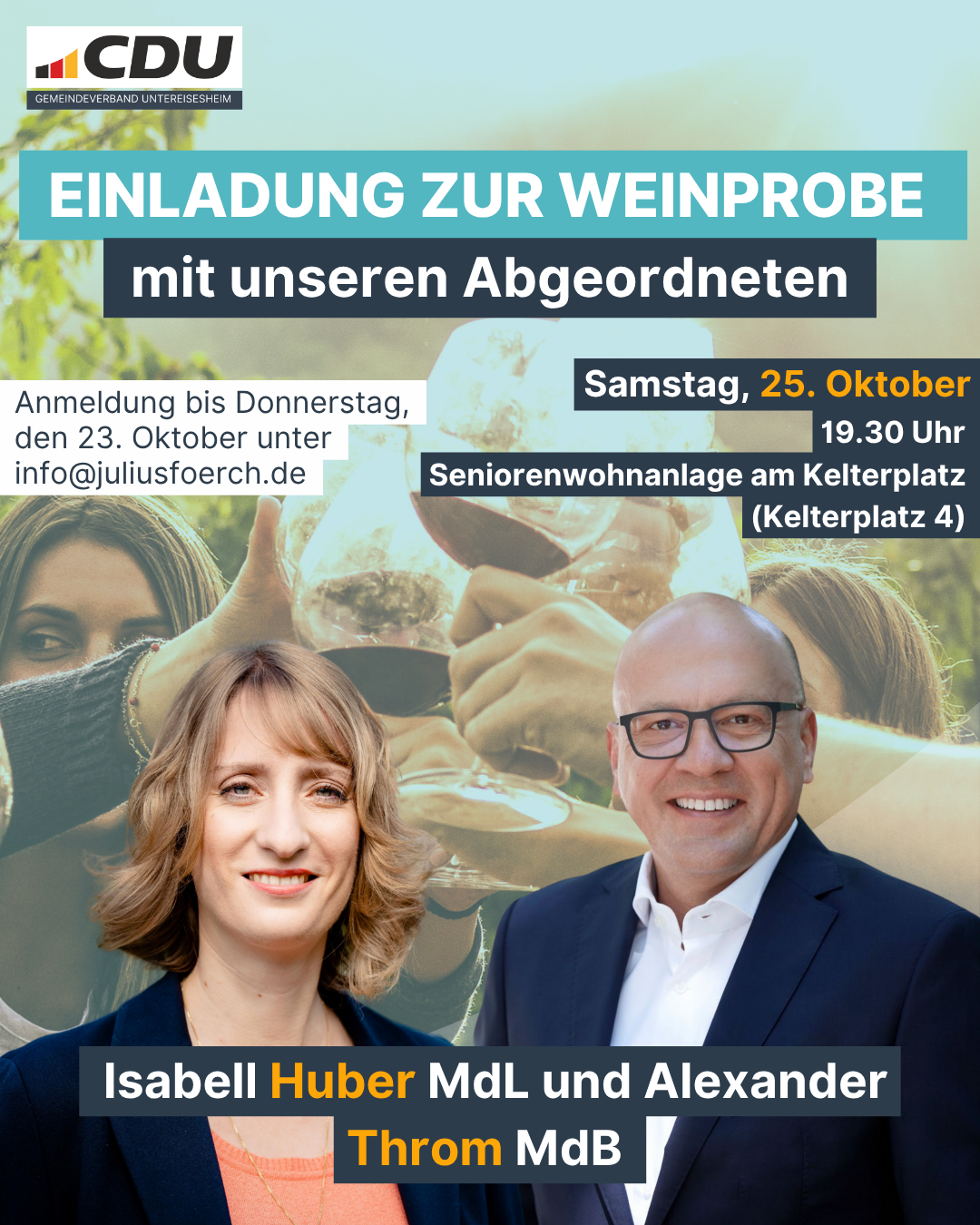 Die CDU Untereisesheim lädt in diesem Jahr wieder herzlich zu ihrer traditionellen Weinprobe ein.